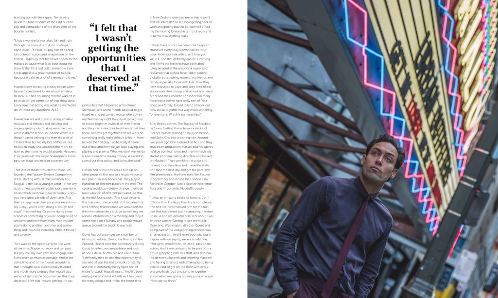 Alex Hassell is not the easiest person to research. Which is strange considering how many projects he’s been a part of and how many full-tilt productions are set to explode globally. When we first spoke he had just gotten back to London after filming in New Zealand, a stay that kept him away for 14 months, the longest time he’s ever been away from home. But with upcoming roles in Joel Coen’s The Tragedy of Macbeth opposite Frances McDormand and Denzel Washington, and having just wrapped the new series on Netflix, Cowboy Bebop, Alex Hassell will be looking at longer stays that keep him away from home.