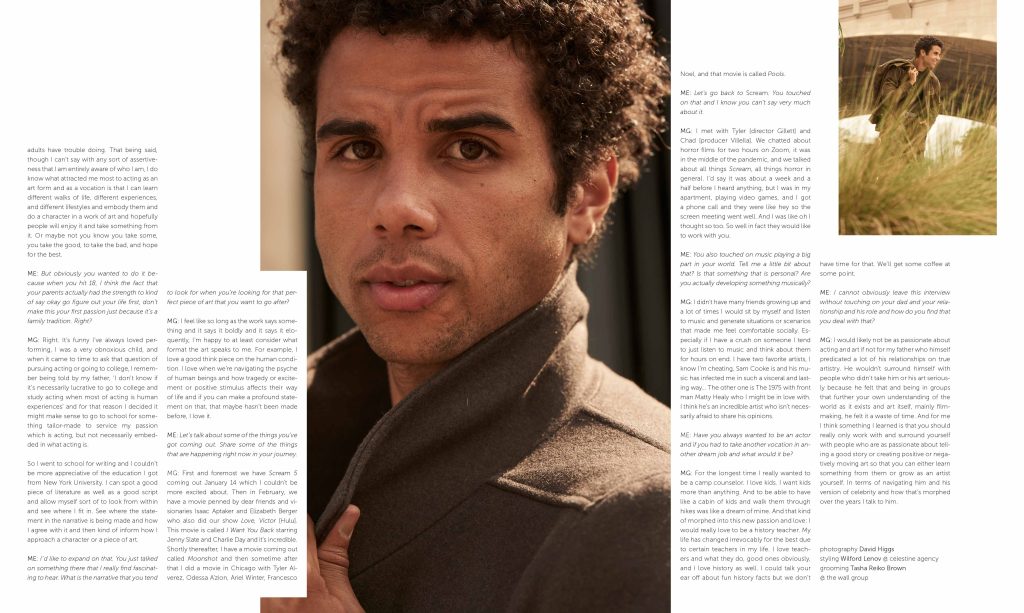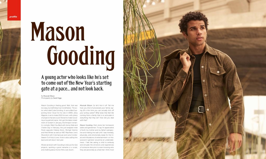 Mason Gooding is feeling good. Wait, that was too easy, but definitely true nonetheless. The actor, who’s dad Cuba Gooding, Jr. won a Best Supporting Actor Oscar for his role in 1996’s Jerry Maguire, is set to make 2022 his own, with a bevy of projects that are a sure-fire bet to make Gooding a household name. He’s got the latest installment of Scream in January, the Amazon romantic comedy I Want You Back with Jenny Slate and Charlie Day in February, the just-wrapped indie Pools opposite Odessa A’zion, Michael Vlarmisand Ariel Winter as well as HBO Max/New Line’sMoonshot with Cole Sprouse and Lana Condor. Season 3 of Hulu’s Love, Victor is also calling him back and will return next year. Moves sat down with Gooding to discuss his new projects, spotting a good narrative in a script, and chatting about horror films over Zoom.