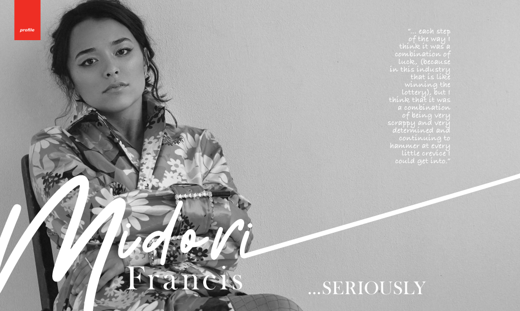 Midori Francis is a Drama Desk and Obie Award recipient for her work in the play The Wolves. She received another Drama Desk nomination for her critically acclaimed performance in Usual Girls. After breaking out in the summer blockbuster Good Boys, she soared on the small screen as Lily in Netflix’s Dash and Lily garnering her an Emmy nomination. She currently stars in Netflix’s Afterlife of the Party and the Mindy Kaling HBO MAX series The Sex Lives of College Girls.