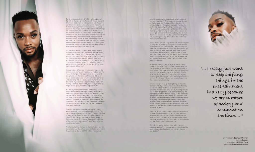 “I really just want to keep shifting things in the entertainment industry because we are curators of society and comment on the time.” J Harrison mentions a particular interest in elevating and illuminating real stories of interesting people, to diversify and amplify the experience of others through acting. “If this human exists somewhere else in the world, let’s tell these kinds of stories. All kinds of stories. I don’t want to be limited in any way.” Despite calling it perhaps cliché, they reference their own role model: Beyoncé, a woman who is creative, intentional, and shares with ease. That diversity of oeuvre, and breadth of creativity, and openness calls to them.