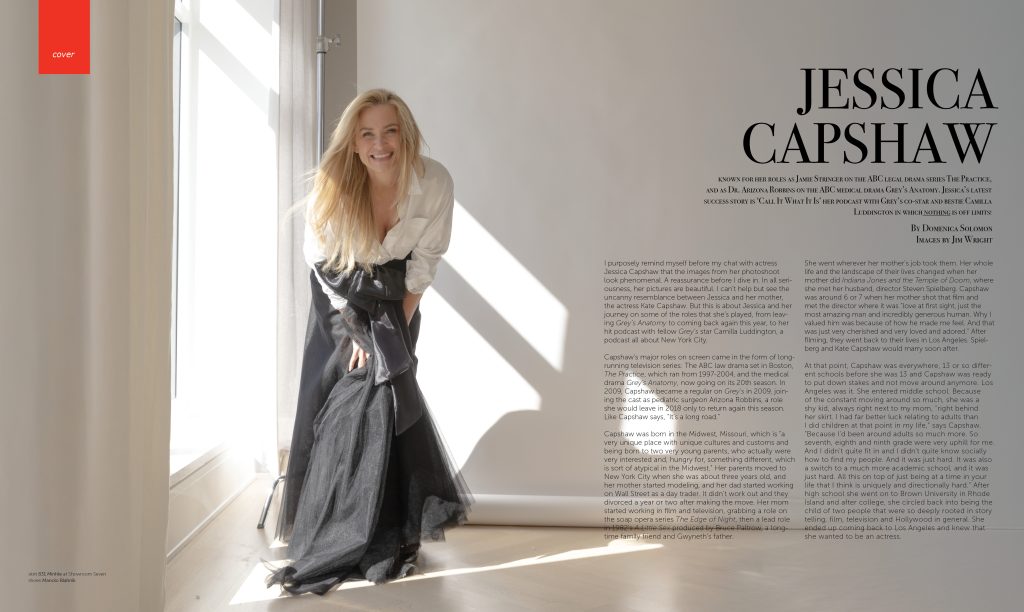 I purposely remind myself before my chat with actress Jessica Capshaw that the images from her photoshoot look phenomenal. A reassurance before I dive in. In all seriousness, her pictures are beautiful. I can’t help but see the uncanny resemblance between Jessica and her mother, the actress Kate Capshaw. But this is about Jessica and her journey on some of the roles that she’s played, from leaving Grey’s Anatomy to coming back again this year, to her hit podcast with fellow Grey’s star Camilla Luddington, a podcast all about New York City.