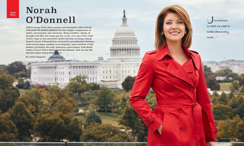 CBS Evening News gives anchor and managing editor Norah O’Donnell the perfect platform for her unique combination of talent, presentation and charisma. Sharp intellect, clarity of thought and film star looks put her at the very top of her trade. Center stage in the network’s recent election coverage, Emmy Award winner O’Donnell has covered five presidential elections, interviewed many notables (even Royalty), and countless world leaders (including the only American conversation with Saudi leader, Crown Prince Mohammed bin Salman. And yes she did ask him about Jamal Khashoggi.)