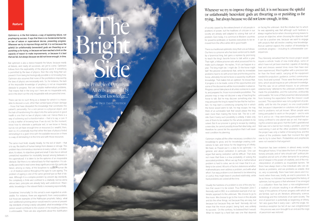 There is a traditional optimistic story that runs as follows. Our hero is a prisoner who has been sentenced to death by a tyrannical king, but gains a reprieve by promising to teach the king’s favorite horse to talk within a year. That night, a fellow prisoner asks what possessed him to make such a bargain. He replies, ‘A lot can happen in a year. The king might die. I might die. Or the horse might talk!’ the prisoner understands that, while his immediate problems have to do with prison bars and the king and his horse, ultimately the evil he faces is caused by insufficient knowledge. That makes him an optimist. He knows that, if progress is to be made, some of the opportunities and some of the discoveries will be inconceivable in advance. Progress cannot take place at all unless someone is open to, and prepares for, those inconceivable possibilities. The prisoner may or may not discover a way of teaching the horse to talk. But he may discover something else. He may persuade the king to repeal the law that he had bro- ken; he may learn a convincing conjuring tick in which the horse would seem to talk; he may escape; he may think of an achievable task that would please the king even more than making the horse talk. The list is infinite. Even if every such possibility is unlikely, it takes only one of them to be realized for the whole problem to be solved. But if our prisoner is going to escape by creating a new idea, he cannot possibly know that idea today, and therefore he cannot let the assumption that it will never exist condition his planning.
