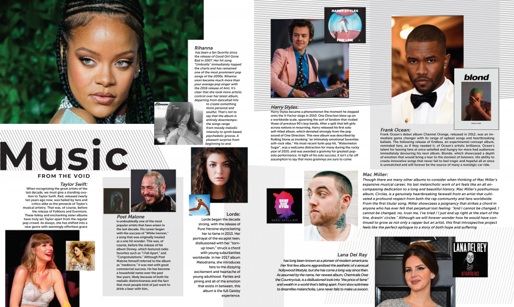 Lorde began the decade strong, with the release of Pure Heroine skyrocketing her to fame in 2013. Her portrayal of the escapist teen, disillusioned with her “tornup town,” struck a chord with young suburbanites worldwide. In her 2017 album Melodrama, she introduces fans to the dizzying excitement and heartache of young adulthood. Parties and pining and all of the emotion that exists in between, this album is the full Gatsby experience.