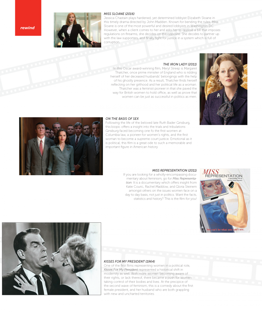 In this Oscar award-winning film, Meryl Streep is Margaret Thatcher, once prime minister of England who is ridding herself of her deceased husbands’ belongings with the help of his ghostly presence. As a result, Thatcher finds herself reflecting on her girlhood and her political life as a woman. Thatcher was a feminist pioneer in that she paved the way for British women to hold office, as well as prove that women can be just as successful in politics as men.